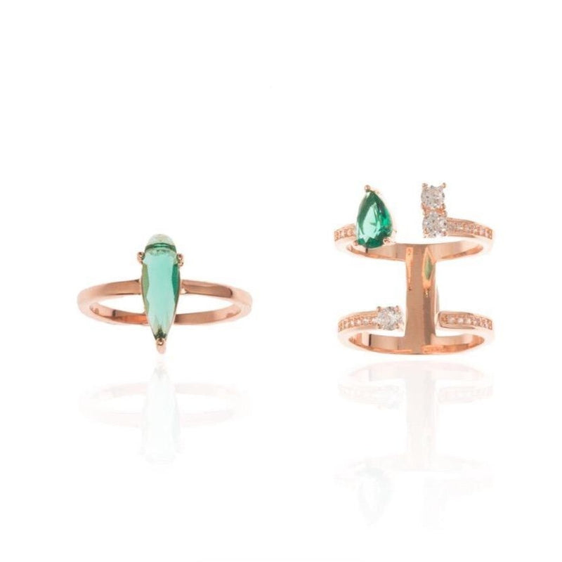 Vintage inspired open ring set handmade with rose gold-plated/rhodium-plated over 925 Sterling Silver. The double band design with feature emerald cubic zirconia crystal makes a stylish stack ring set. These beautiful gemstone rings nickel free and adjustable. - Adjustable, US size 6.5.